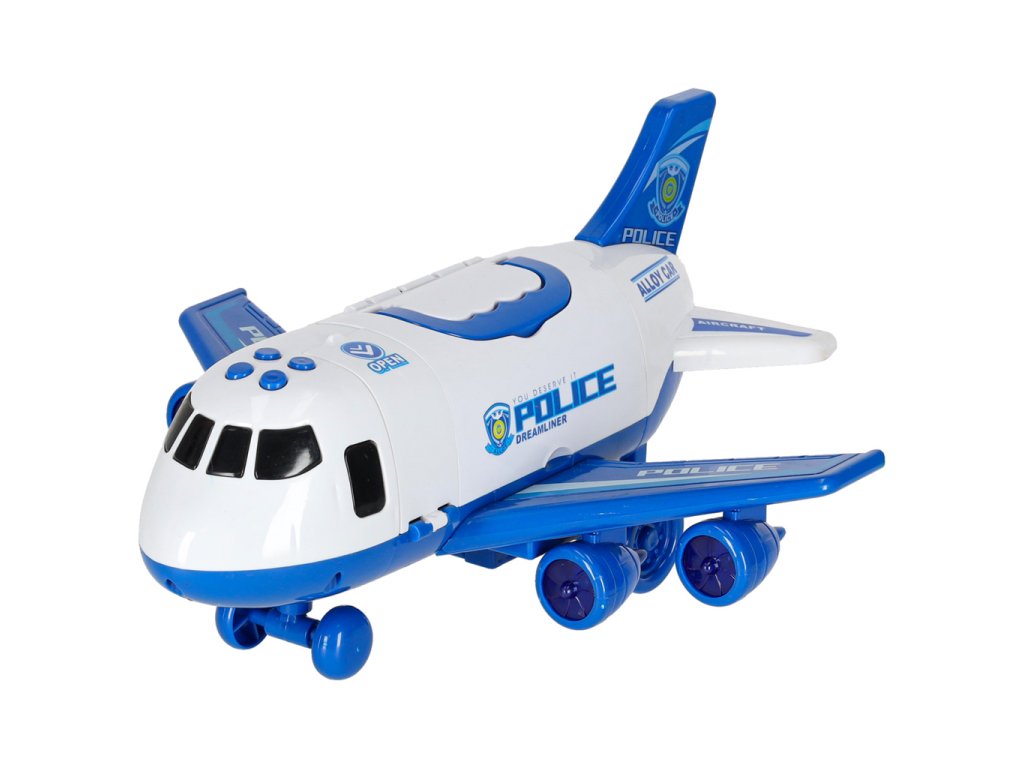 Transportní letadlo s 3 policejními auty a doplňky – se světlem a zvukem