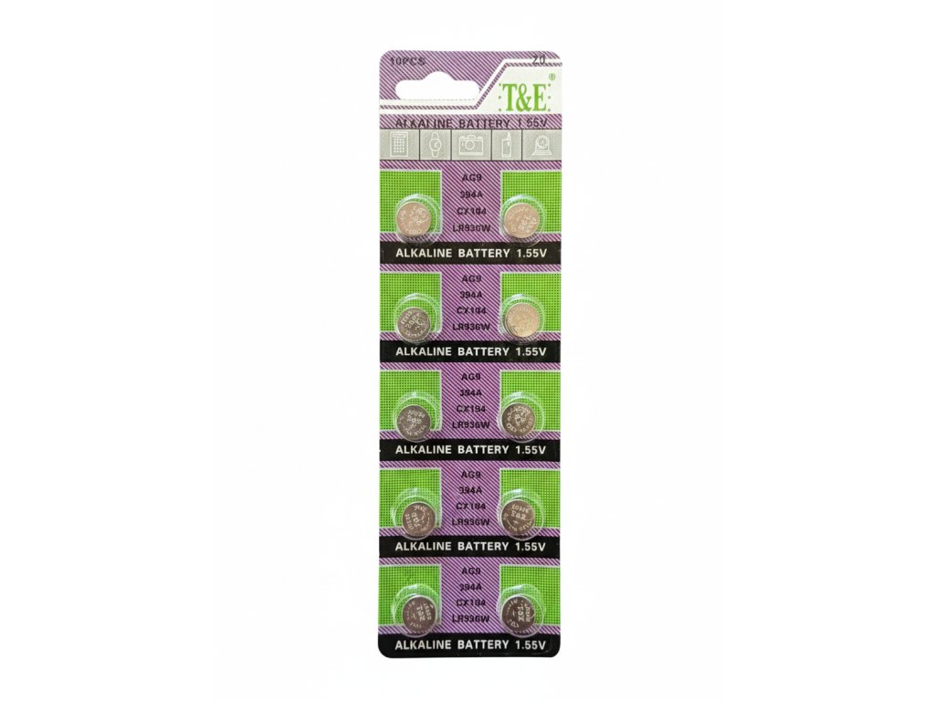 Typ článku alkalický knoflíkový, model AG9 / 394A, napětí 1.55 V, počet v balení 10 ks, ekvivalentní označení SR936SW, 394, V394, D394, LR936.