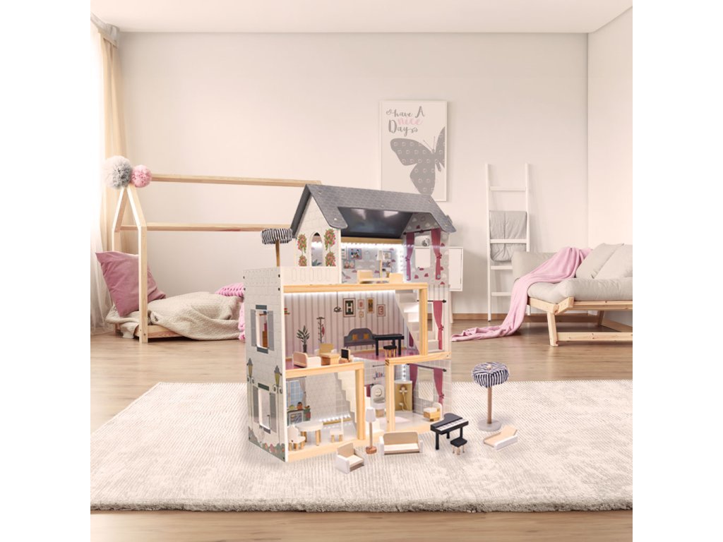 MDF dřevěný domeček pro panenky + nábytek 78cm černý LED