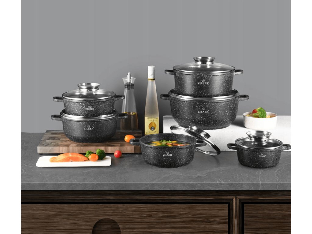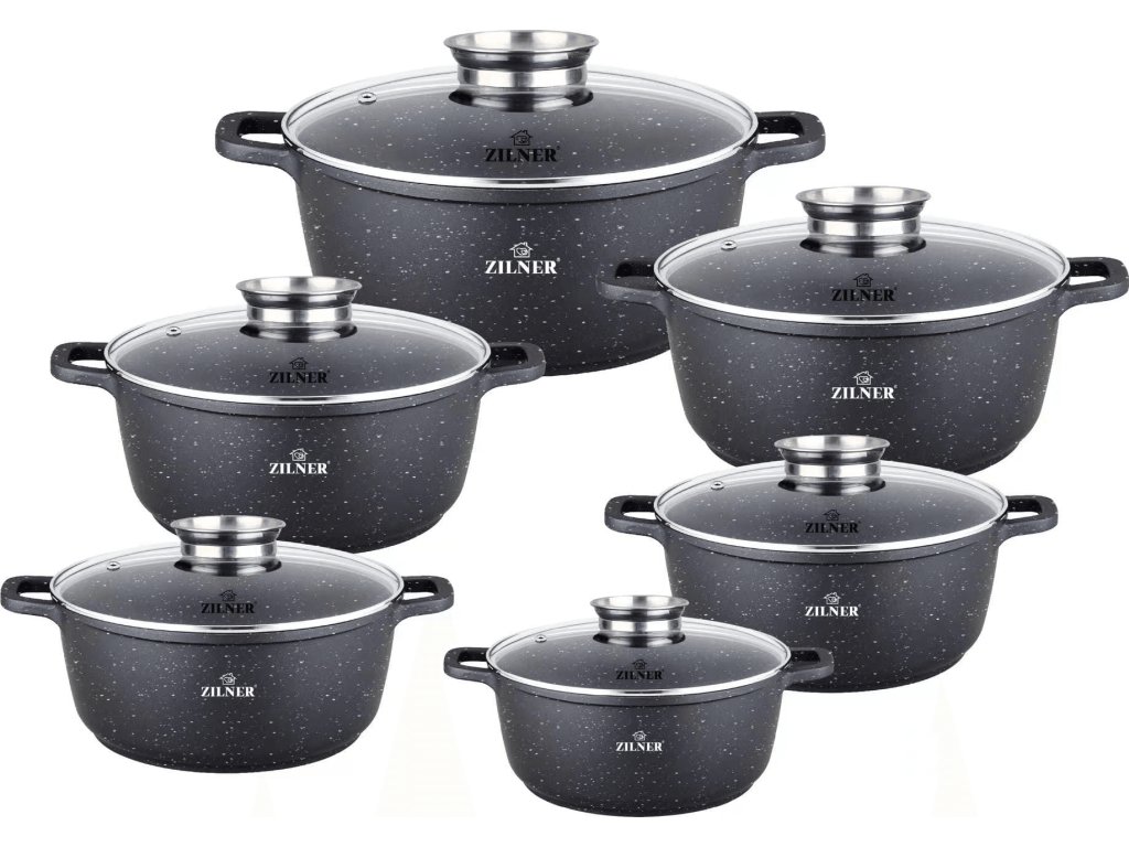 Sada hrnců s černým keramicko-mramorovým povrchem a poklicemi, 12 dílná