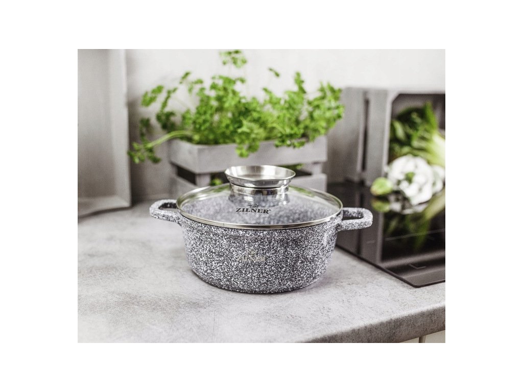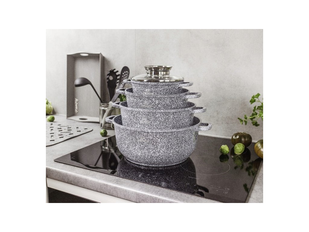 Tato 17 dílná sada kuchyňského nádobí s keramicko-mramorovým povrchem v moderním šedém provedení je ideální volbou pro každou domácnost, která si zakládá na pohodlí, bezpečnosti a estetice při vaření. Nádobí je vyrobeno z odolného hliníku s nepřilnavou vnitřní vrstvou, která usnadňuje přípravu pokrmů i jejich čištění. Díky feromagnetickému dnu je vhodné pro všechny typy sporáků – včetně indukčních – a odolá i vysokým teplotám v troubě.