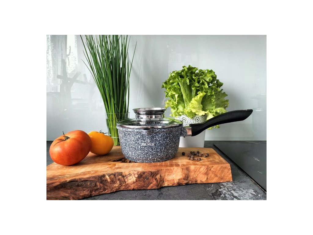 Tato 17 dílná sada mramorového nádobí přináší spojení moderního designu, vysoké funkčnosti a komfortu při každodenním vaření. Hrubé pětivrstvé dno umožňuje rychlé a rovnoměrné rozložení tepla a usnadňuje vaření i úsporu energie. Nepřilnavý mramorový povrch je antibakteriální, odolný proti připalování a umožňuje vaření s minimálním množstvím tuku – ideální pro zdravý životní styl.