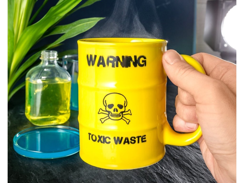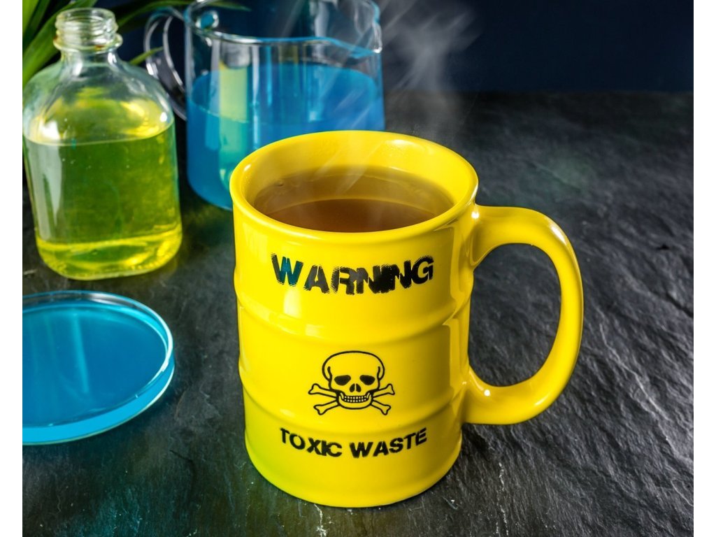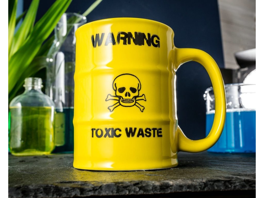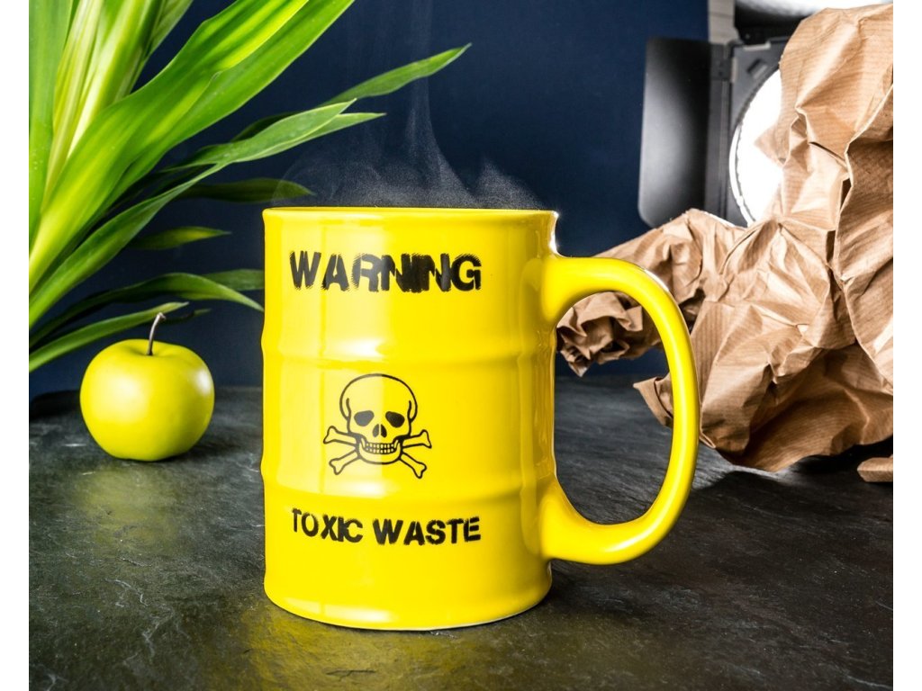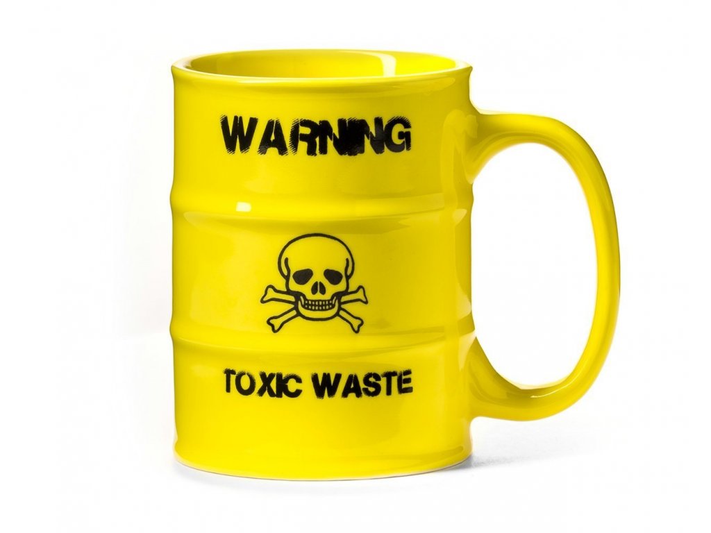 Kousek hrnku ve tvaru sudu v zářivě žluté barvě a s výmluvným textem WARNING TOXIC WASTE a symbolem mrtvé lebky, aby nikdo nepochyboval o tom, že obsah je silně toxický ;)