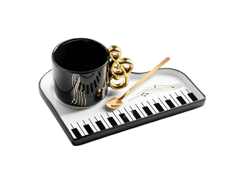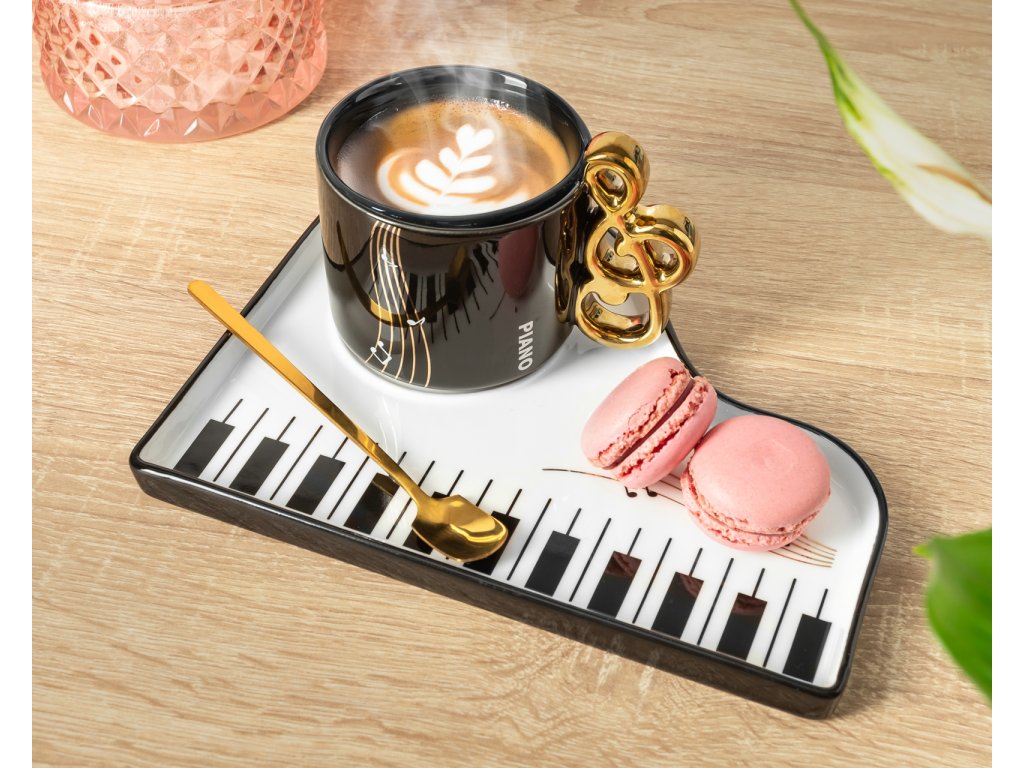 Podšálek ve tvaru klavíru je nejen elegantní základnou pro šálek, ale i originálním designovým kouskem s motivem klávesnice a černými akcenty. Zlatá lžička dodává celému setu luxusní nádech a dokonale doplňuje jeho sofistikovaný vzhled.