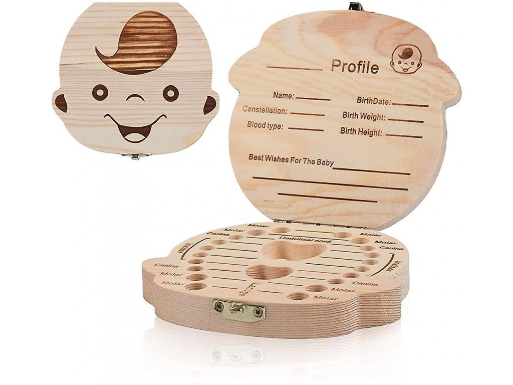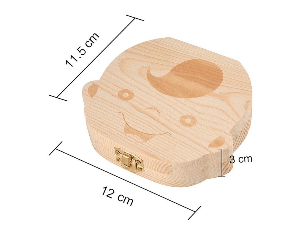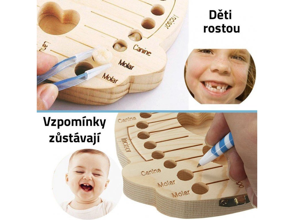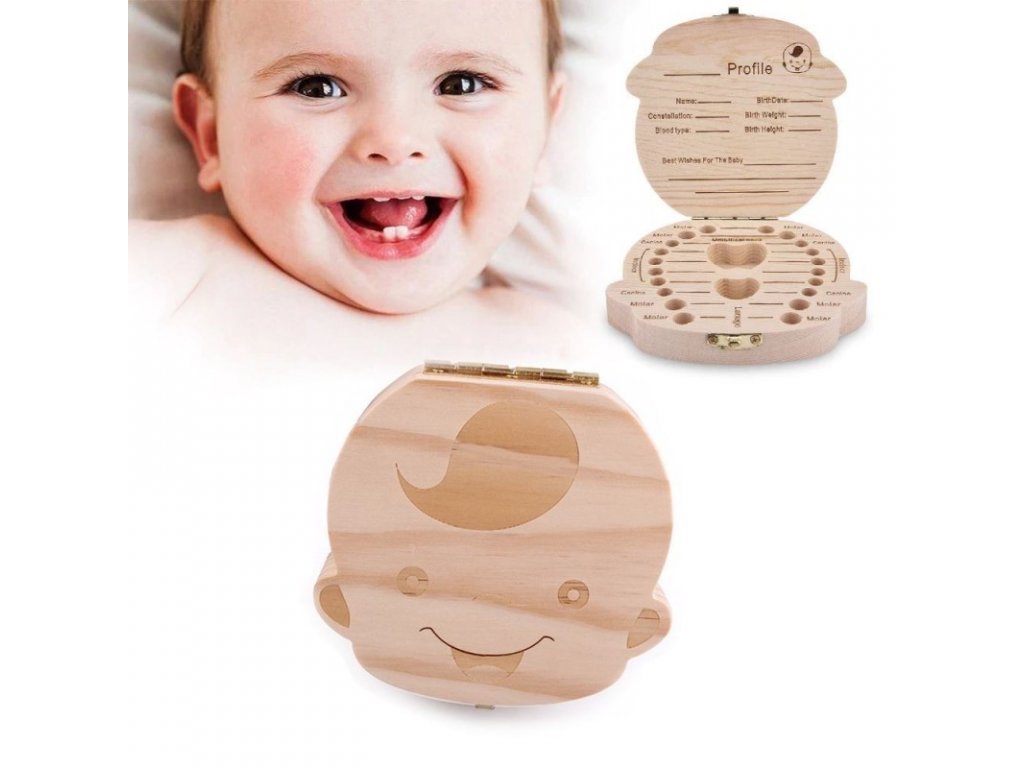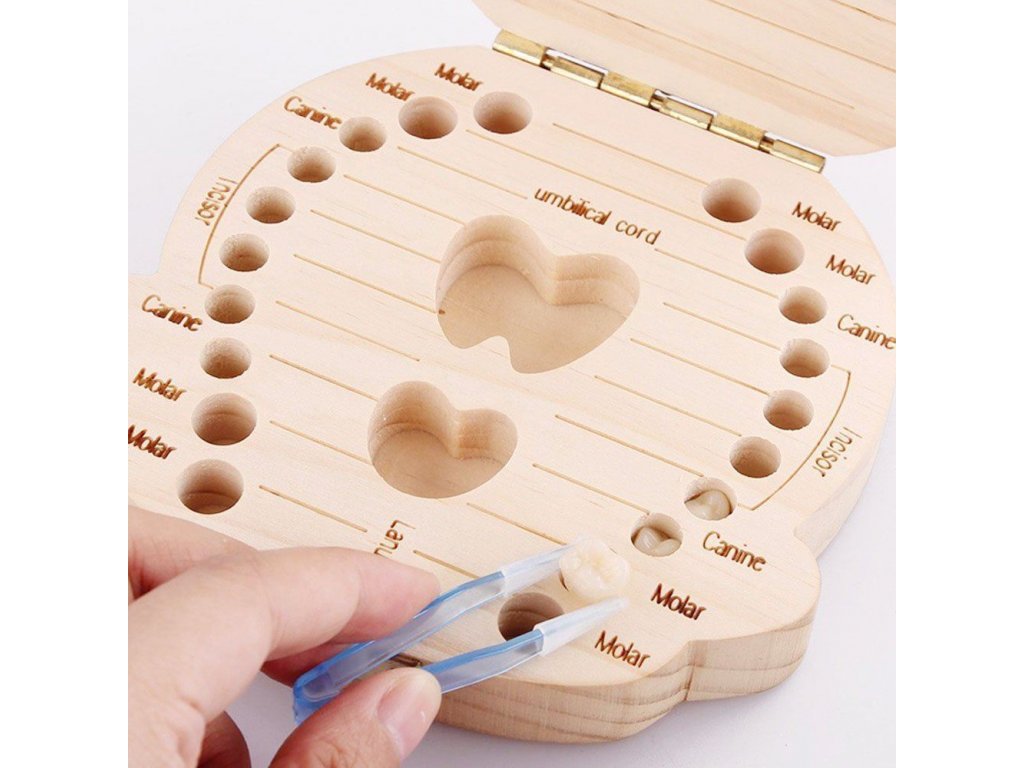 Krásná dřevěná krabička slouží k uchování vypadnutých mléčných zoubků vašich dětí. Celá krabička je vybavená anglickými nápisy zubů a také si zde můžete dopsat osobní údaje vašich dětí, jako je jméno a datum narození.