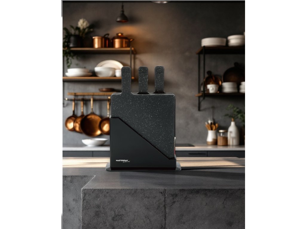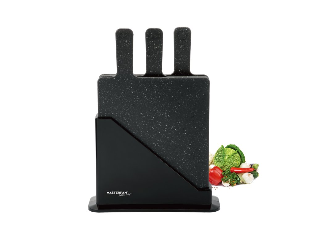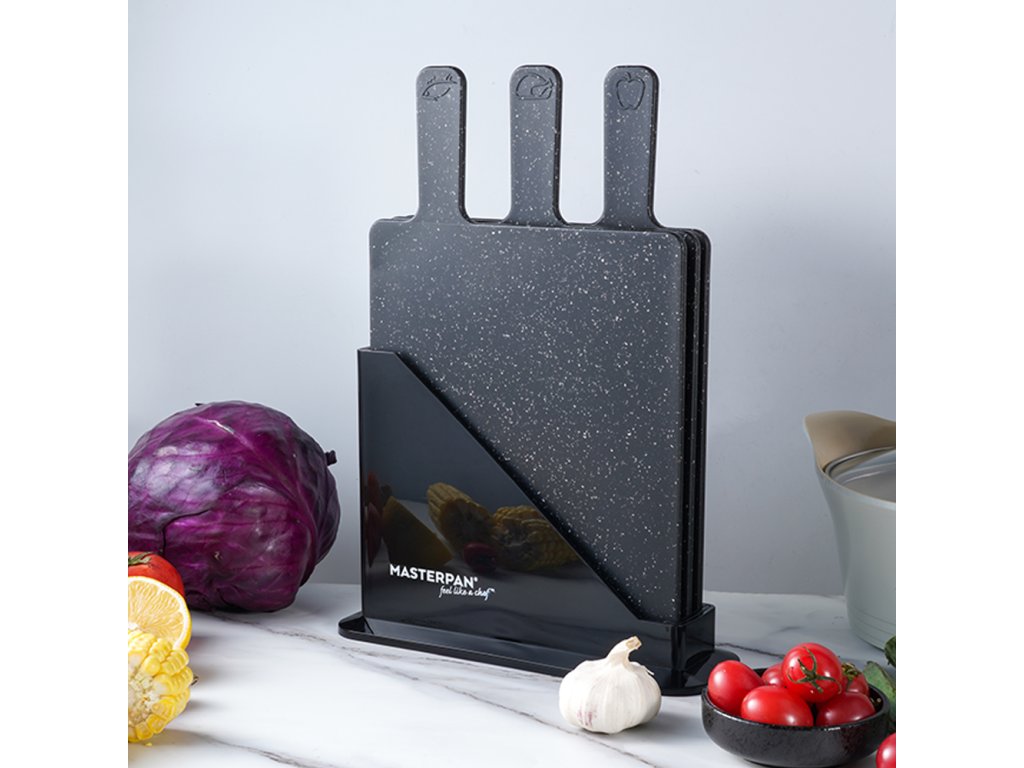 Každá deska má praktickou velikost (20 × 32 × 0,6 cm), která je ideální pro různé kuchyňské úkony. Součástí sady je stojan, který umožňuje snadné a přehledné skladování, čímž pomáhá udržet pořádek v kuchyni.