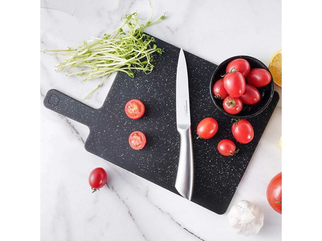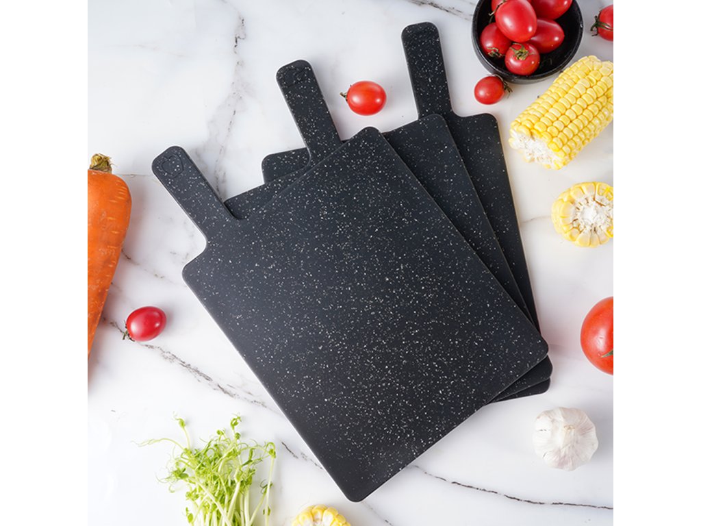 Elegantní černé provedení s mramorovými tečkami dodává kuchyni stylový vzhled a zároveň poskytuje hygienický povrch pro přípravu jídla. Desky jsou odolné proti poškrábání a skvrnám, chrání pracovní plochu a usnadňují krájení ovoce, zeleniny, masa i pečiva.