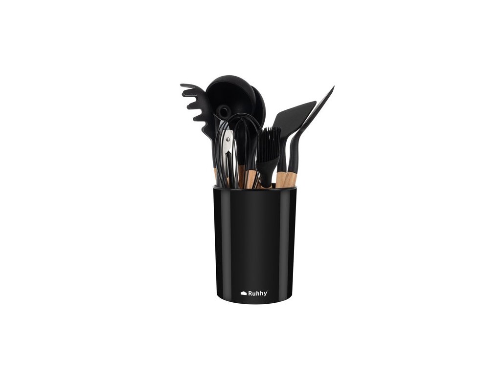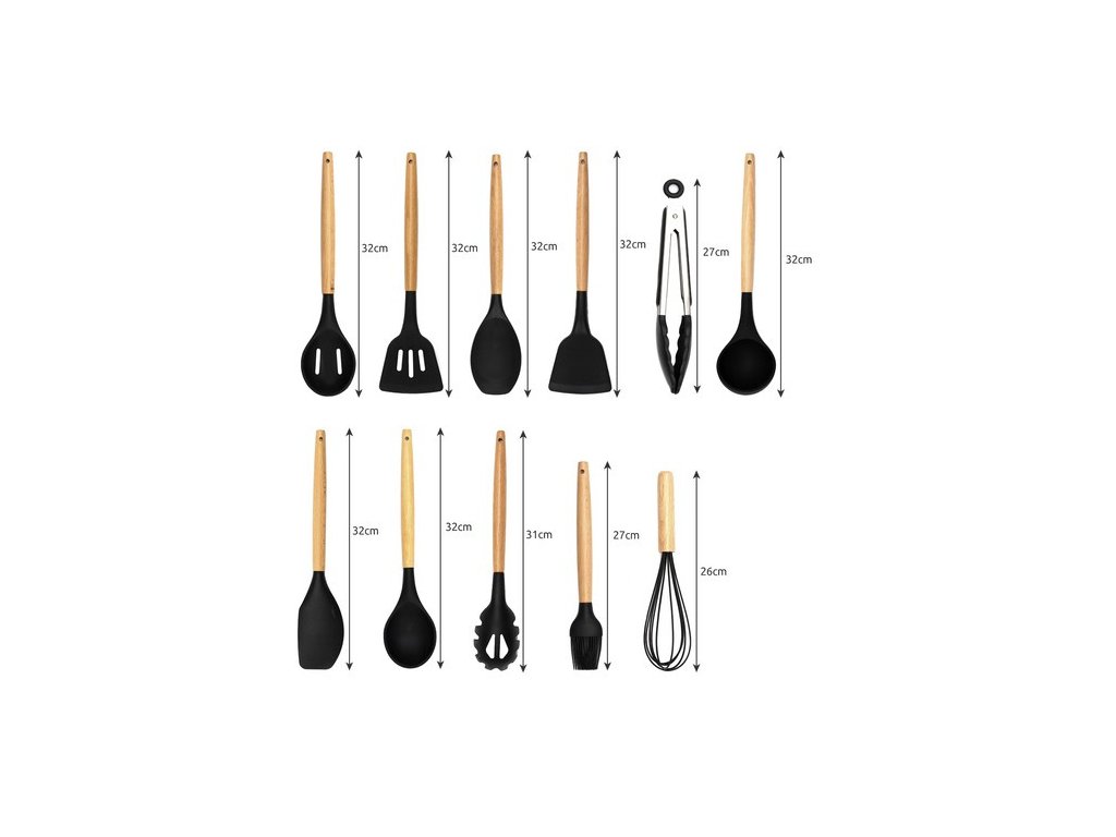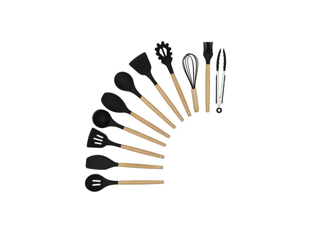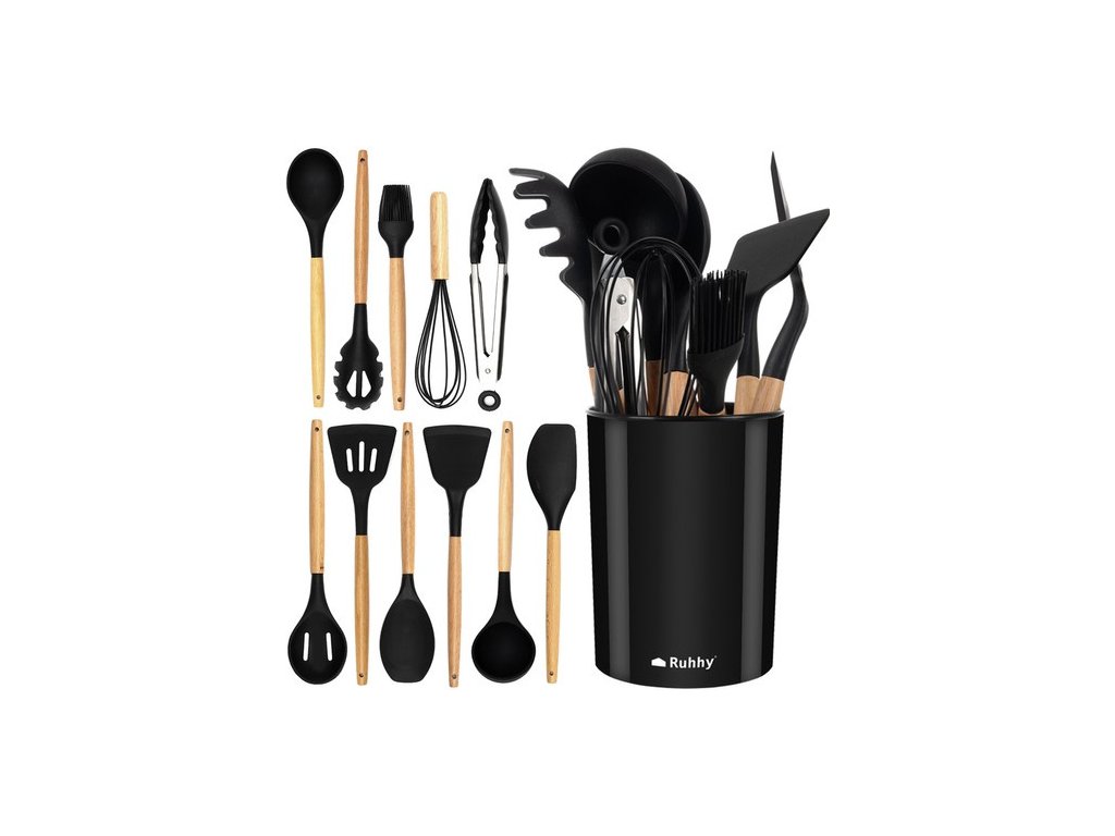 Pořiďte si kompletní sadu silikonového kuchyňského náčiní, která obsahuje 11 různých pomůcek a odkapávač/nádobu na příbory. Každý kus je vyroben z kombinace dřeva a kvalitního silikonu, který je odolný až do 230 °C, takže je ideální pro každodenní vaření.