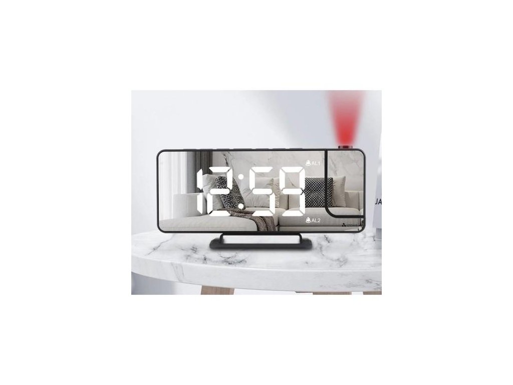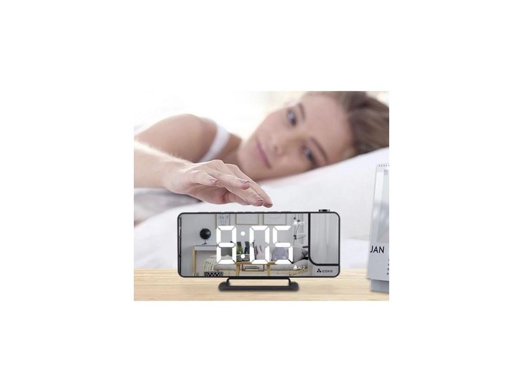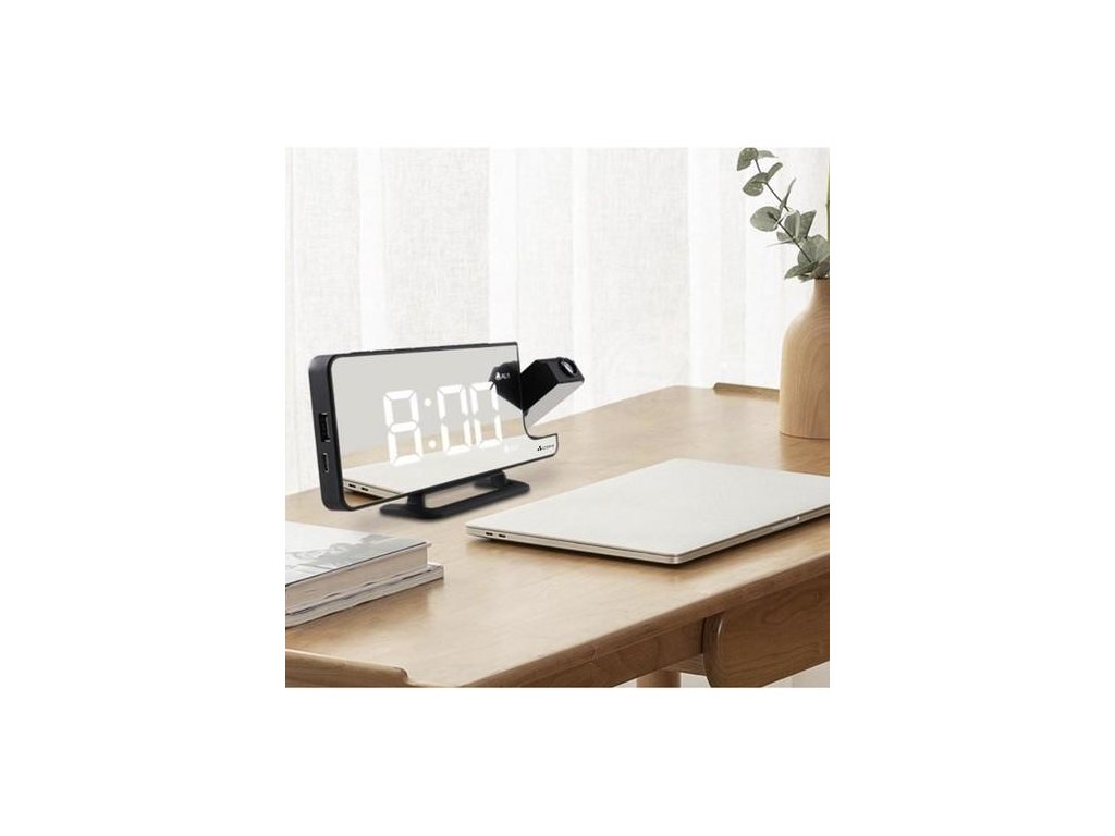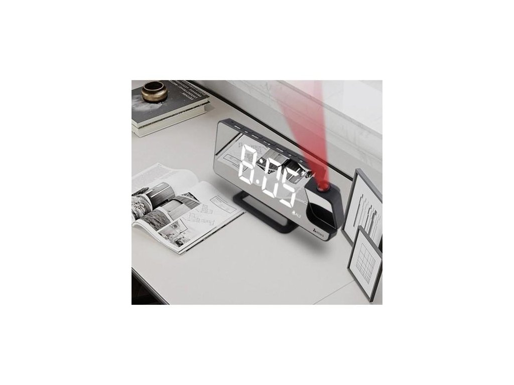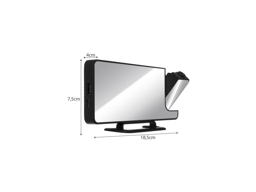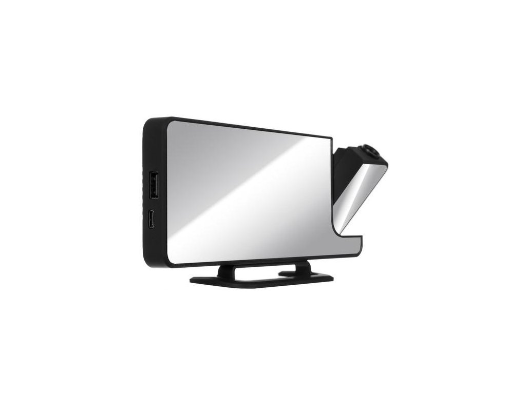 - 4v1 - hodiny, budík, zrcadlo a projektor ! Vše v jednom kompaktním zařízení. Budík je vybaven zrcadlovým čelem, na kterém se zobrazují informace jako je čas. Kompaktní rozměry a nízká hmotnost vám umožní vzít si jej na cesty. Skvěle se bude hodit i při spaní ve stanu, kde zrcadlové čelo umožňuje rychlý make-up a účes.
