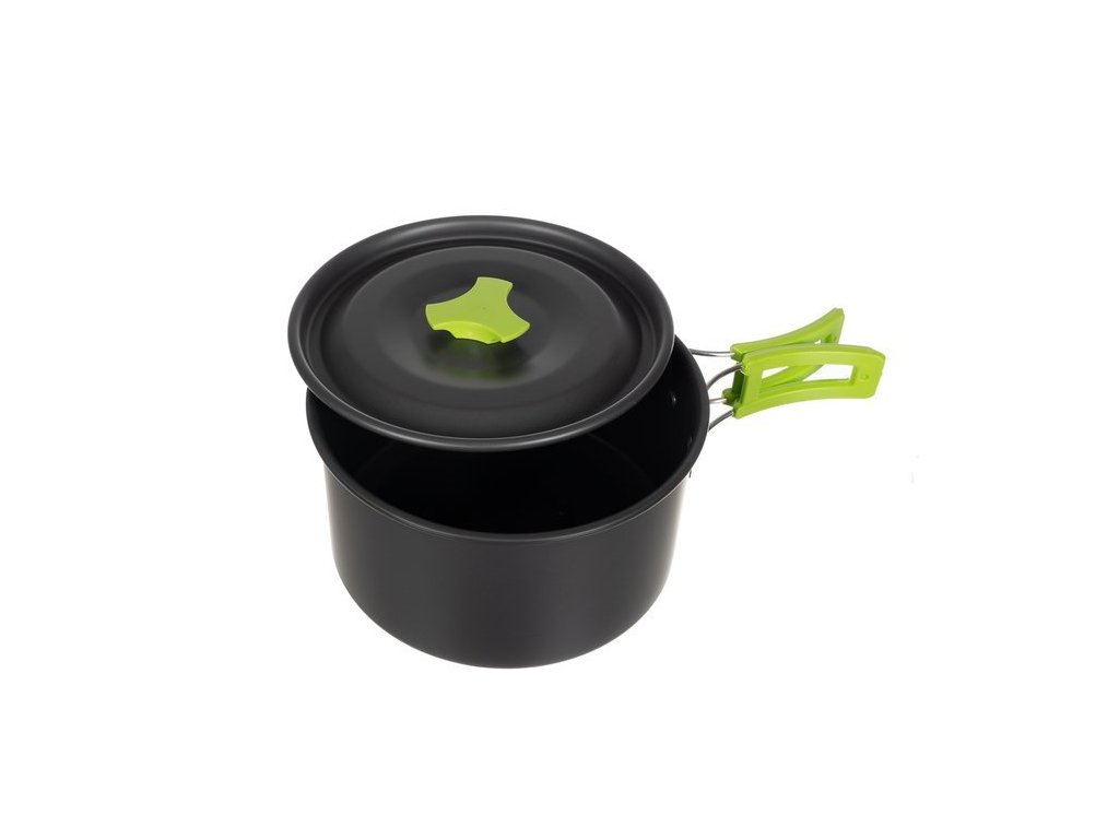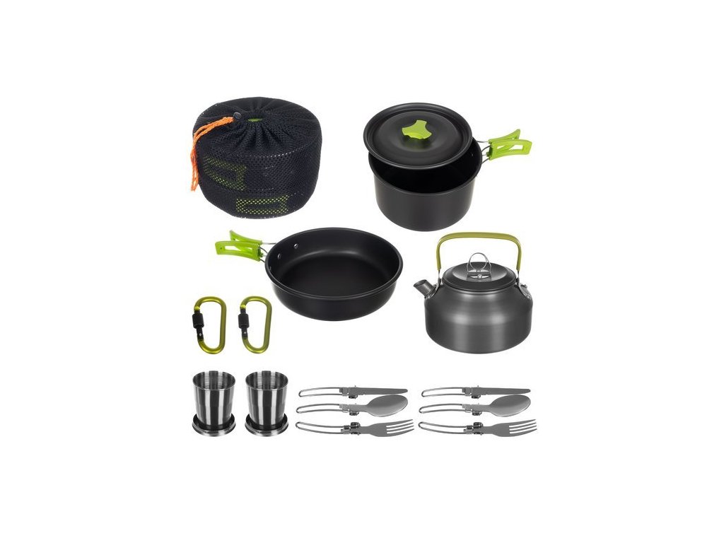TURISTICKÉ NÁDOBÍ - SET UNIVERZÁLNÍ - přenosné kuchyňské náčiní je sada, kterou lze použít prakticky kdekoli. Ideální jak na doma, tak na cesty, například kempování nebo kempování. Sada je určena pro 2 osoby. Sklopná madla umožňují snadnou přepravu nádobí.