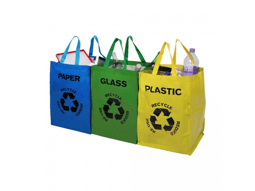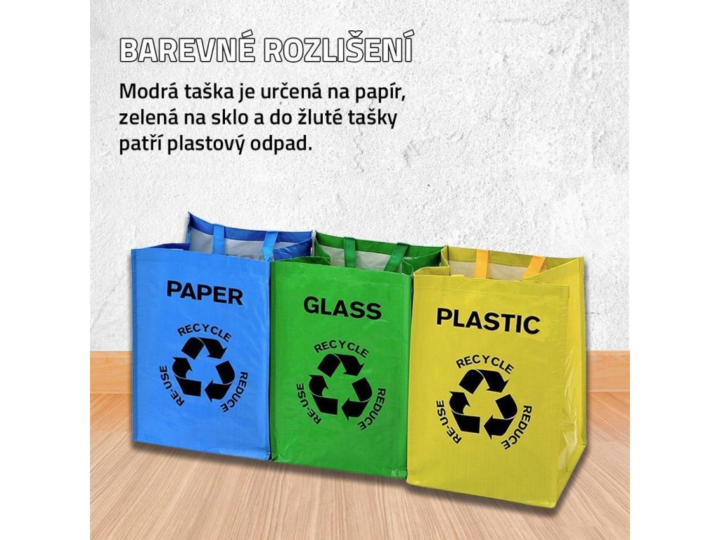 Každá taška má odlišnou barvu a je na ní vyznačeno, jaký typ odpadu do které patří. Každý tak bude ihned vědět, kam má vyhodit plastový, papírový nebo skleněný odpad. Všechny tašky jsou opatřené velkými pevnými uchy, takže v momentě, kdy se taška naplní, lze ji pohodlně odnést a vysypat do příslušného kontejneru. Prázdnou tašku snadno složíte do menších rozměrů a doma bude opět připravena k dalšímu použití.