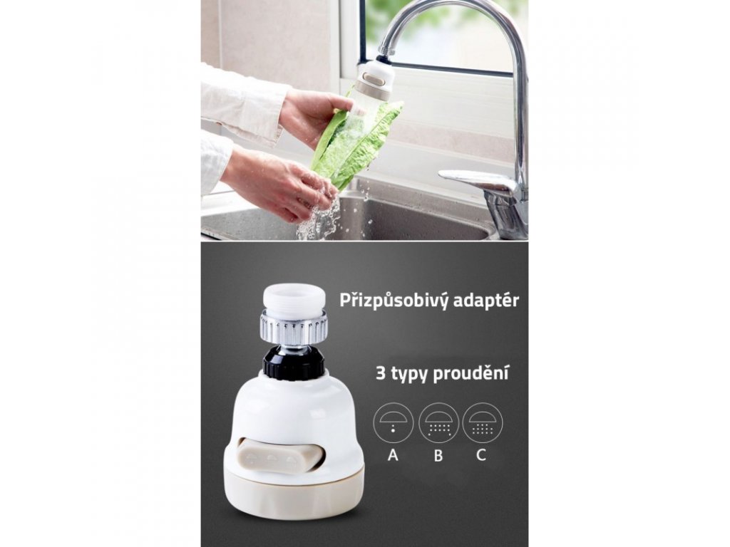 Tento adaptér můžete připevnit buď v kuchyni či v koupelně: v obou místnostech bude mít stejnou funkci. Díky třem typům proudění vám ušetří spoustu vody a vám se bude pohodlně a úsporně mýt nádobí či oplachovat zelenina či ovoce.