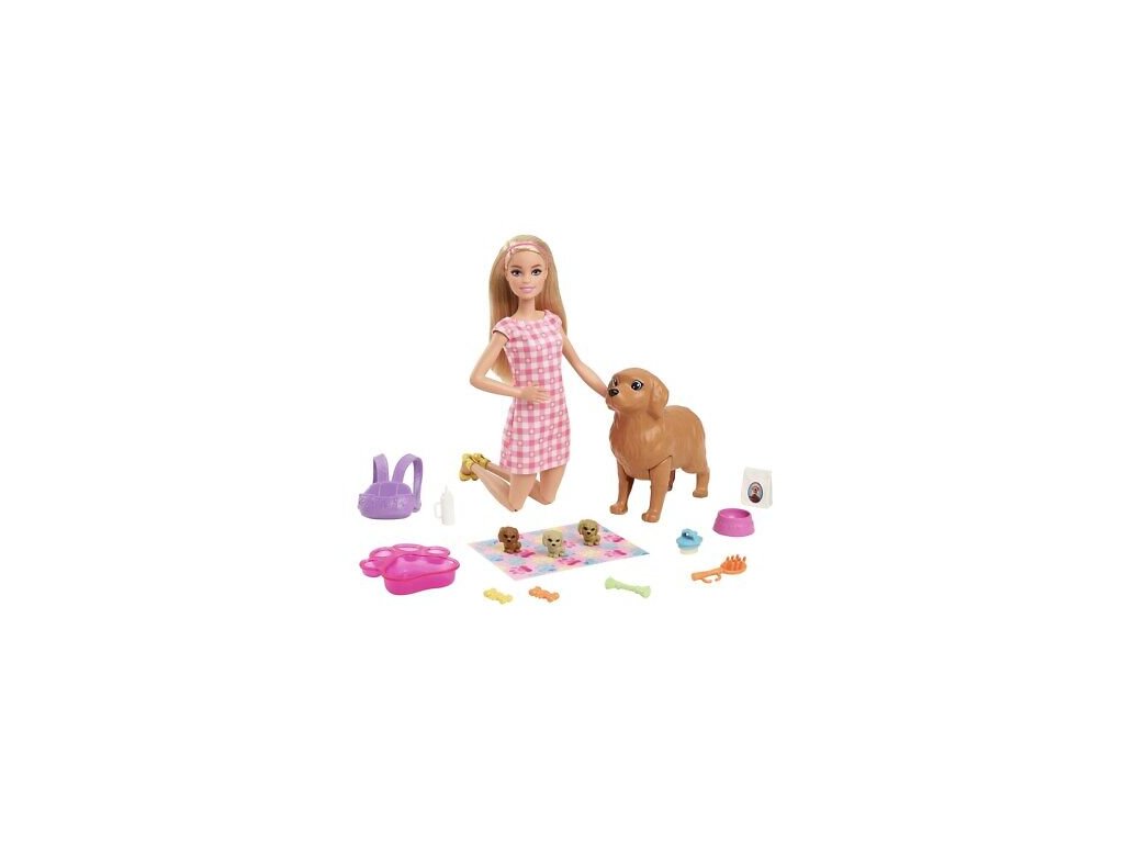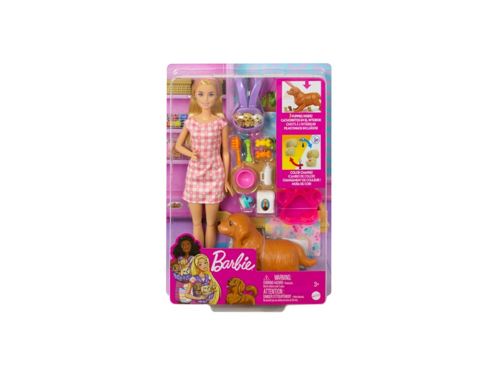 Máte doma milovníky pejsků a panenky Barbie? Sada Barbie Novorozená Štěňátka jim umožní stát se součástí psí rodinky. Stačí stisknout záda fenky a na svět přijdou tři roztomilá štěňátka. Děti objeví kouzelná mateřská znaménka, která se ukazují ve studené vodě a mizí v teplé. Panenka Barbie s ohebnými klouby se snadno postará o fenku i štěňata a díky bohatému příslušenství si děti mohou hrát na malé pečovatele či veterináře.