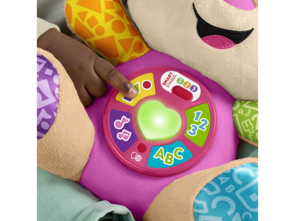Mluvící pejskova sestřička Smart Stages® z řady Směj se a Poznávej! je ideální kamarádka pro vaše dítě. Hebká plyšová hračka reaguje na stisknutí pěti tlačítek na bříšku, které rozsvítí srdíčko barevnými světly a spustí více než 80 písniček, frází a zvuků.
