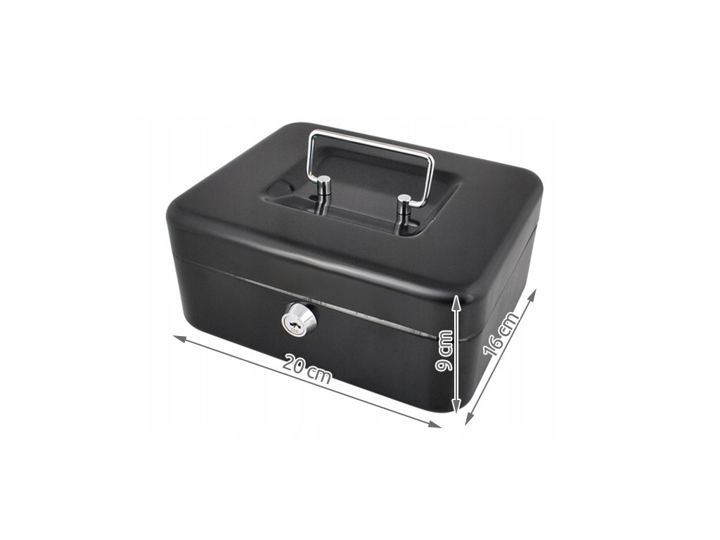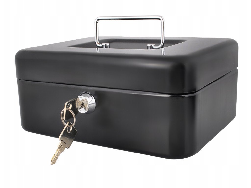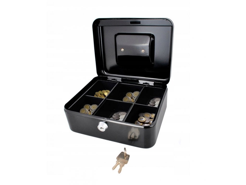 Kovová uzamykatelná příruční pokladna vybavená plastovou vložkou na mince.