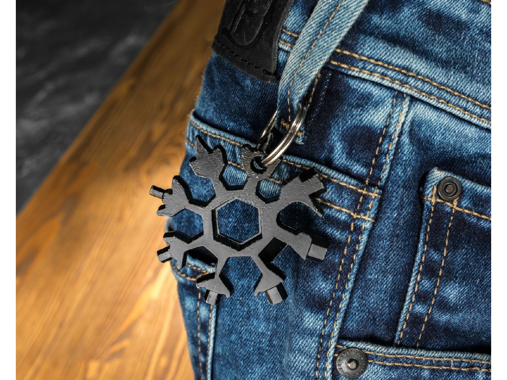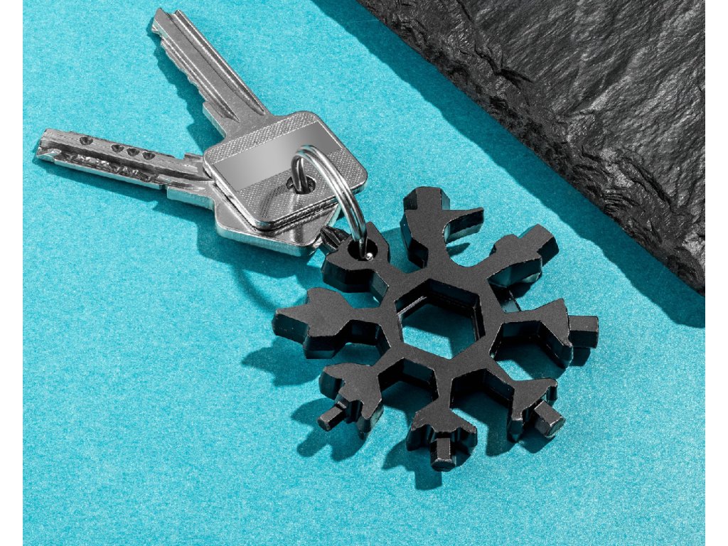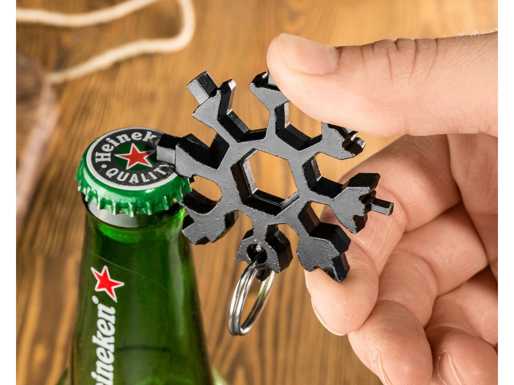 Multifunkční nástroj (18v1) v kapesní velikosti!. Velmi užitečné doma i venku. Naše sněhová vločka obsahuje 18 typů funkčních nástrojů: otvírák na láhve, řezač kabelů, plochý šroubovák a řezač krabic, křížový šroubovák, imbusové klíče různých velikostí (3 mm, 4 mm, 5 mm, 6 mm, 7 mm, 8 mm), ploché klíče různých velikostí 7 mm, 8 mm, 9 mm, 10 mm, 11 mm, 12 mm, 14 mm.
