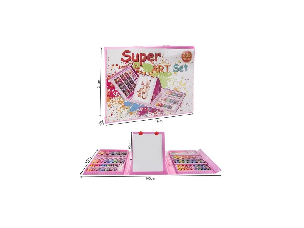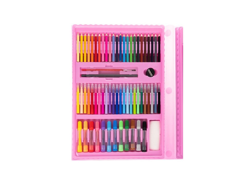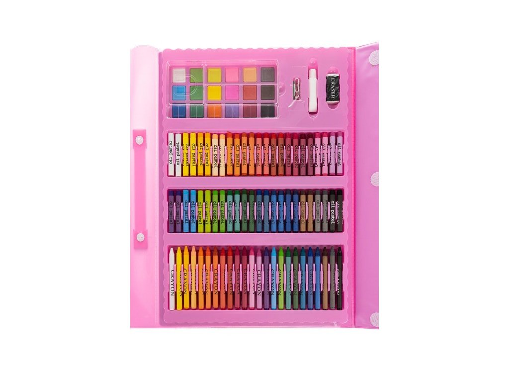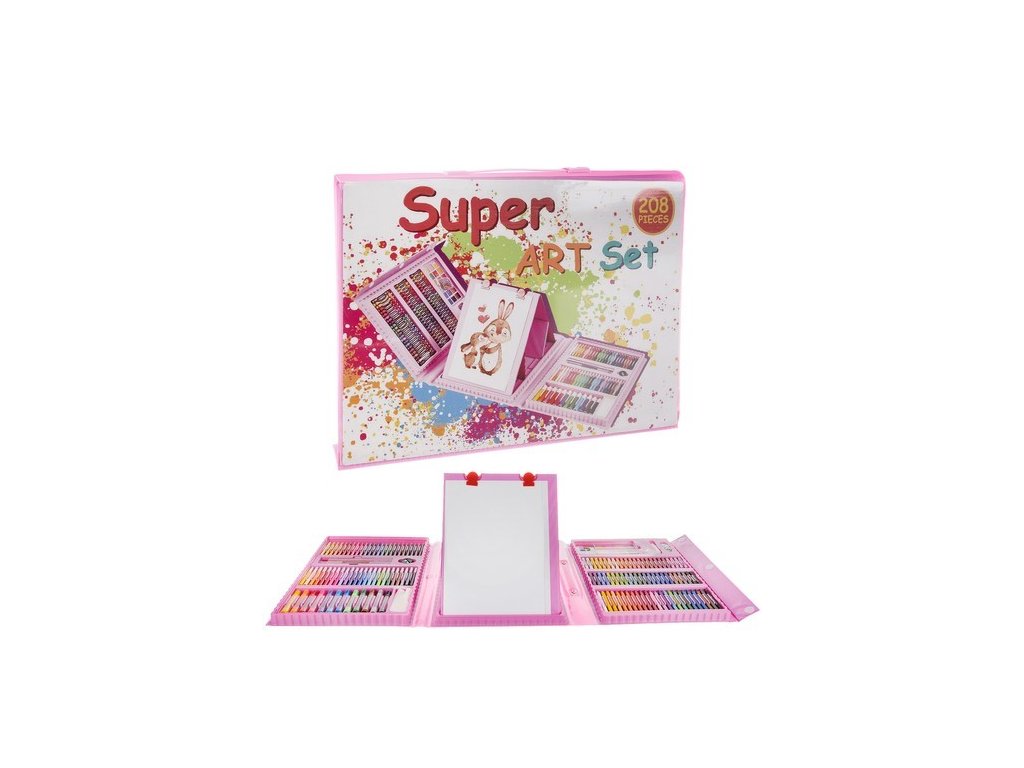 - Malířský set v kufru má až 208 prvků, včetně: kufru 12 silných fixů, 24 tužek, 24 voskovek, 48 olejových pastelů, 18 barev akvarelových barev, 24 fixů, 1 pravítko, 30 kancelářských sponek, 1 štětec, 1 ořezávátko, guma, 4 klipy, 1 tužka, 1 paleta, 1 lepidlo, 15 listů A4, 1 houbička.